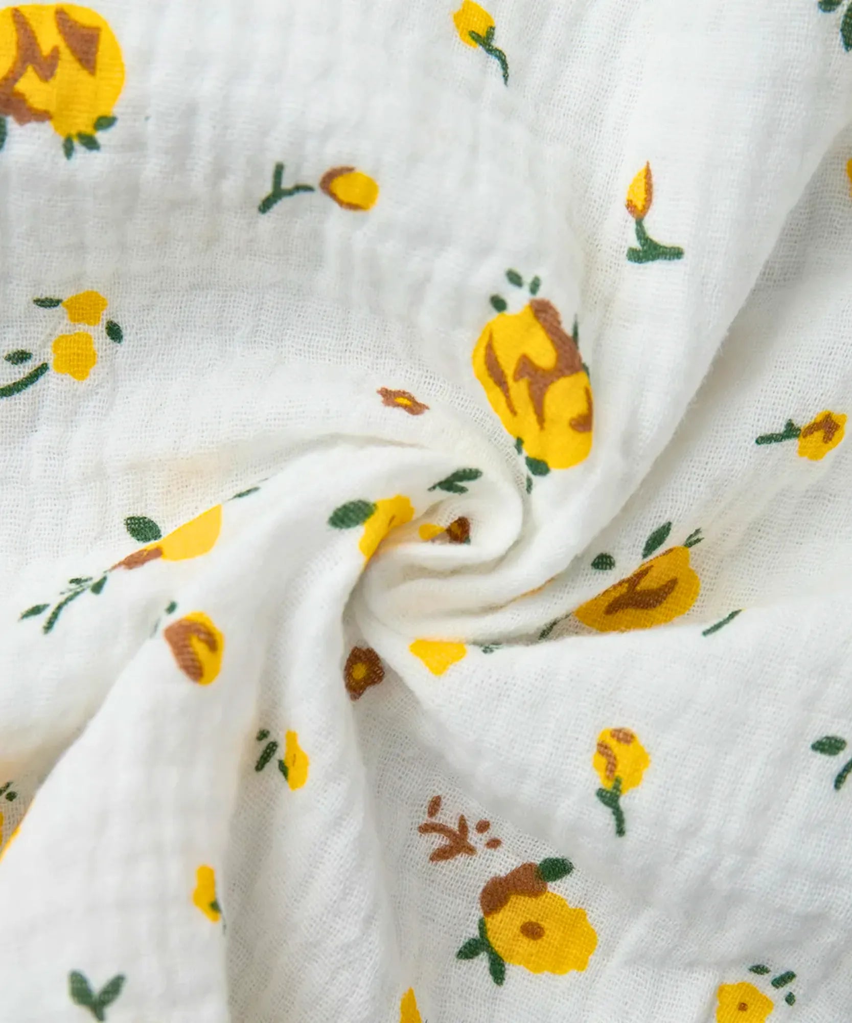 As pequenas flores douradas sobre fundo claro criam um visual luminoso e encantador.